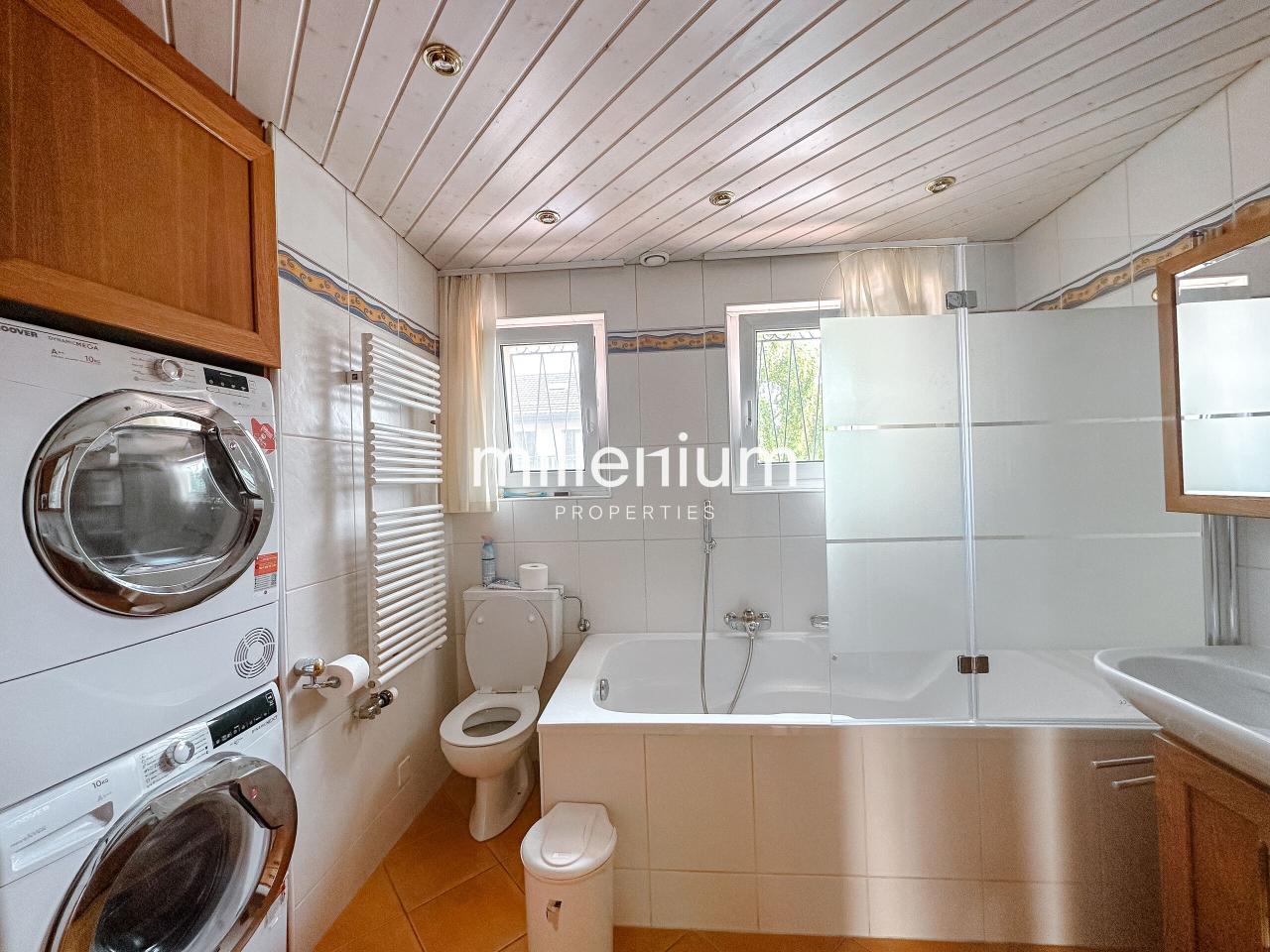 Le rez-de-chaussée se compose d’un hall d’entrée, d’une spacieuse cuisine semi-ouverte entièrement équipée, d’un double séjour lumineux avec cheminée, de trois chambres à coucher ainsi que d’une salle de bains avec colonne lave-linge/sèche-linge.