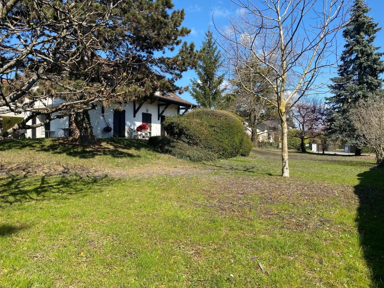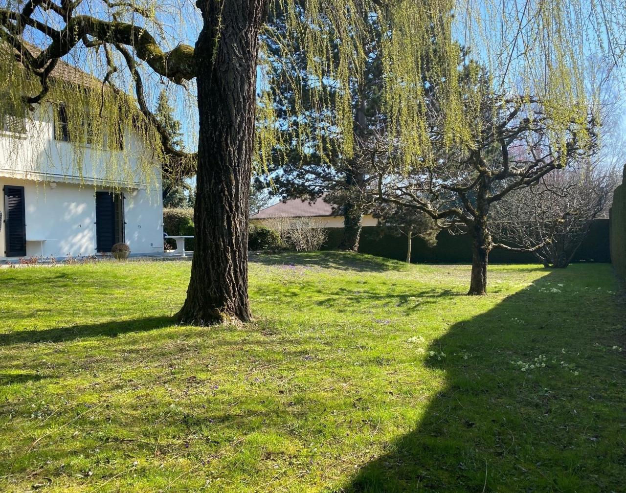 En extérieur : Un beau jardin piscinable et bien entretenu entoure cette villa avec deux terrasses.