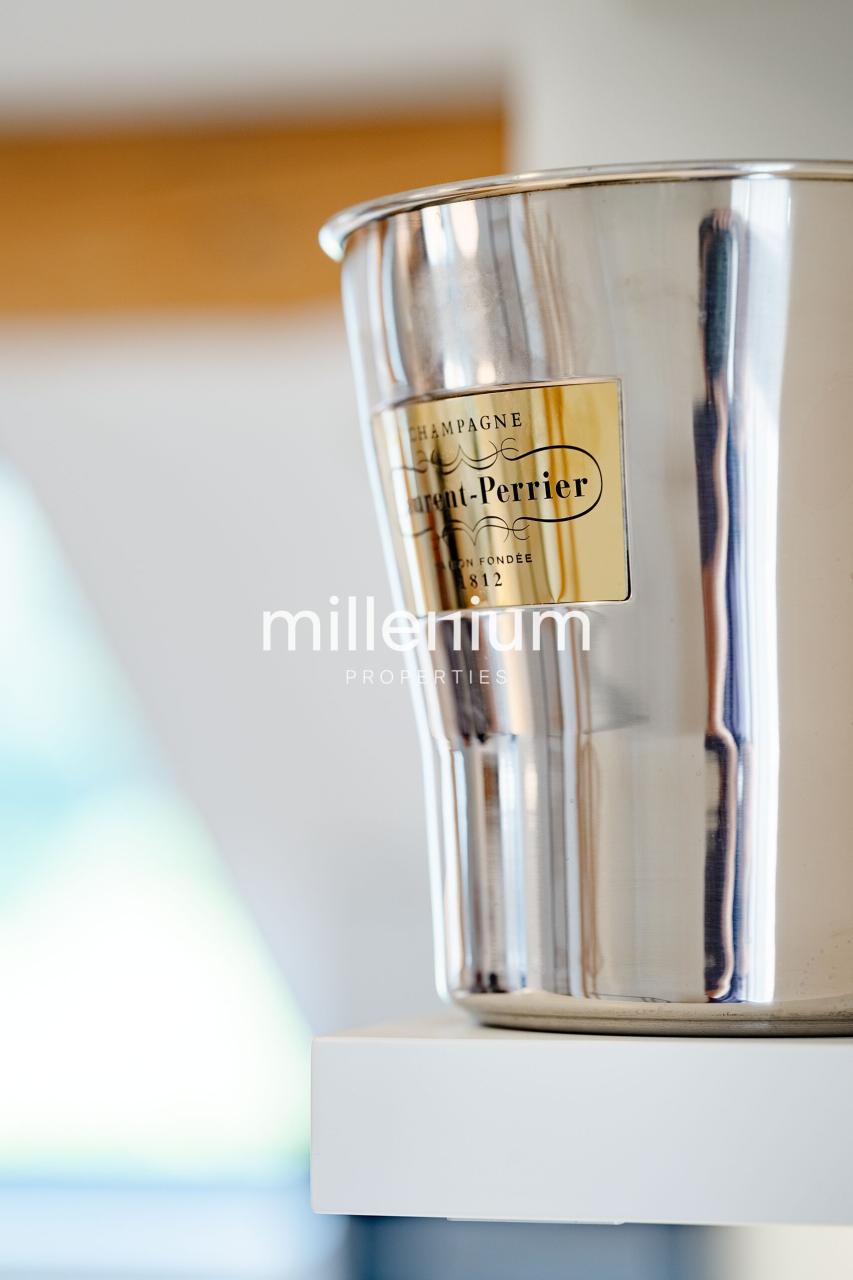 - Une cuisine ouverte parfaitement équipée (four vapeur encastré, cave à vins, machine à laver le linge, etc) avec un bar à cocktail intégré, signature chic de l’appartement,