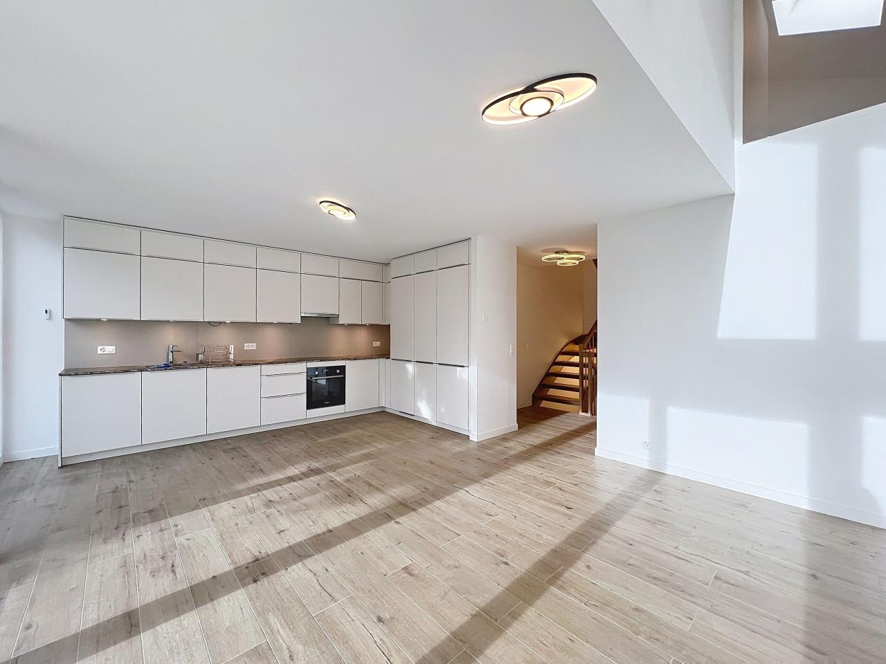 The entrance hall opens onto a spacious living area, extended by a modern open-plan kitchen of 32 sqm, flooded with natural light thanks to large floor-to-ceiling windows. This level provides direct access to the terrace and garden, and also includes a dining area as well as a walk-in shower room.